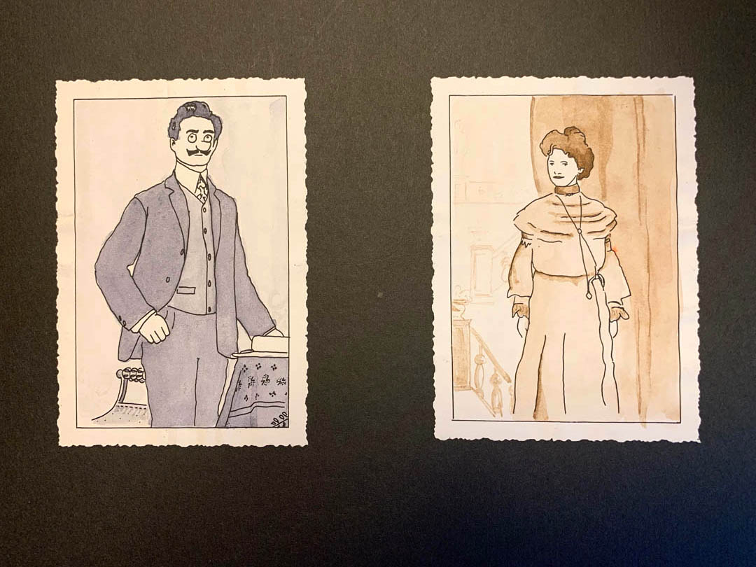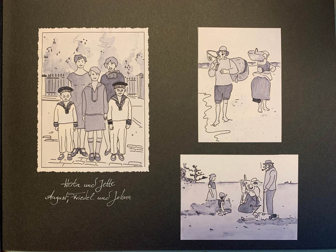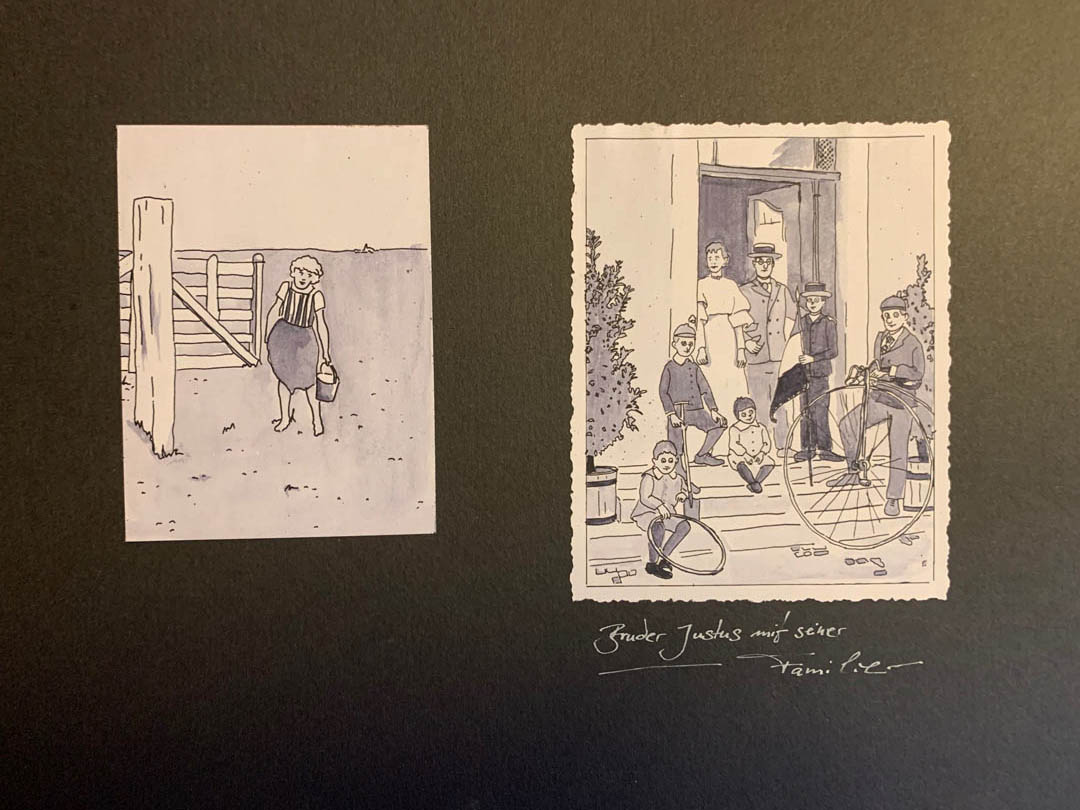 Der cartoonographische Lichtbildner-Apparat kam Ende des 19. Jahrhunderts zeitgleich mit der Photocamera auf den Markt. Leider konnte er sich damals nicht durchsetzen und so sind seine Cartoon-Abzüge heute wahre Goldstücke. Ich hatte das Glück ein komplettes Familienalbum im Nachlass meiner Oma finden und jetzt mein Eigen nennen zu können